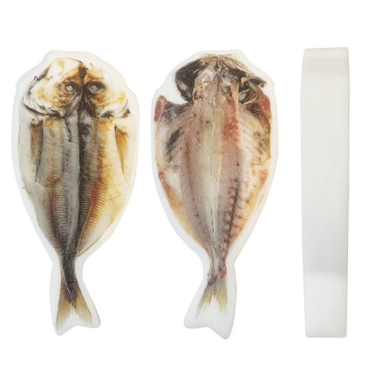 一見すると本物の干物と見間違えるほど精巧にプリントされたデザインが目を引く本商品ですが、その正体は、お風呂で使用できる柔らかなバススポンジです。