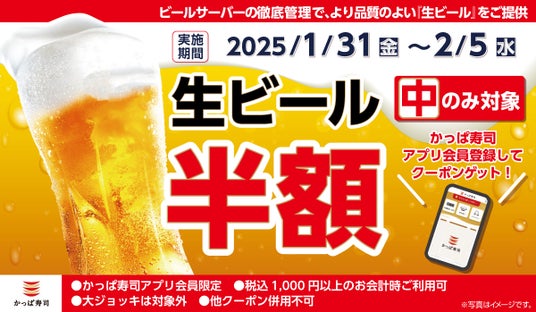 2025年1月31日(金)~2月5日(水)アプリ会員限定「生ビール(中)半額キャンペーン」概要
