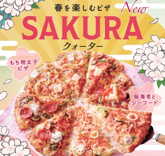 『さくらクォーター』は、春の旬食材・桜海老が味わえる「桜海老とシーフード」や、大人気「もち明太子ピザ」などの4種類を一度に楽しめるクォーターピザです。