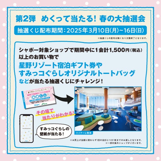 シャポー・ビーンズの対象ショップで期間中に、1会計1,500円(税込)以上お買い上げで、星野リゾート宿泊ギフト券50,000円分(20名さま) 、すみっコぐらしのオリジナルトートバッグ(1,000名さま)、すみっコぐらしの壁紙(80,000名さま)が当たる抽選くじにチャレンジできます。