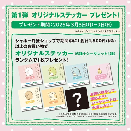 シャポー・ビーンズの対象ショップで期間中に、1会計1,500円(税込)以上お買い上げで、すみっコぐらしのオリジナルステッカーをランダムで1枚プレゼント!