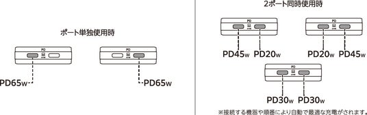 ※2ポート同時使用時は合計最大65W出力となります。接続する機器や順番により自動で最適に充電されます。