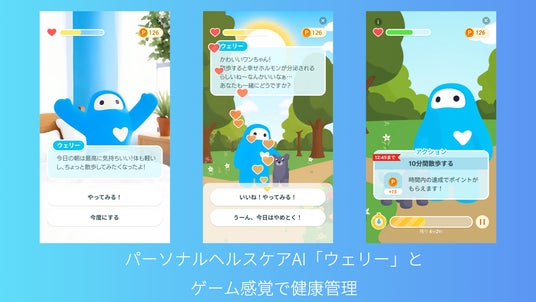 パーソナルヘルスケアAI「ウェリーくん」が、ユーザーのデータに連動し、まるでそばで見守るパートナーのように寄り添いながら、ゲーム感覚の健康管理ができる仕組みを搭載しており、楽しみながら疲れや不調からのリカバリー習慣を促進します。「今日はこんなチャレンジをしてみよう!」といったアクションを促し、小さなチャレンジを積み重ねるたびに、コンディションがどんどん最適化されます。