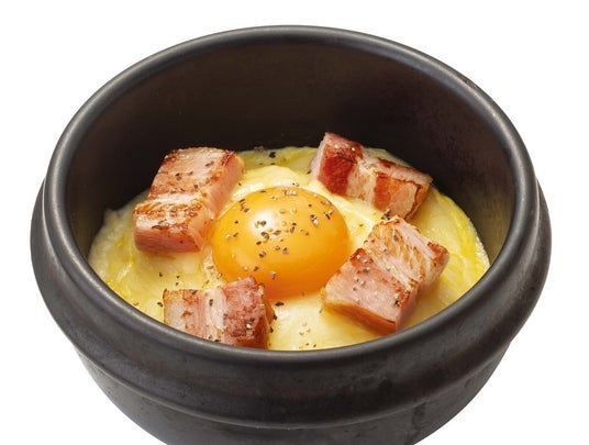 熱々の石鍋の中にたっぷりチーズをかけたドリア。とろけるチーズとクリーミーなカルボナーラソースを合わせた逸品。厚切りベーコンがゴロっと入っています
