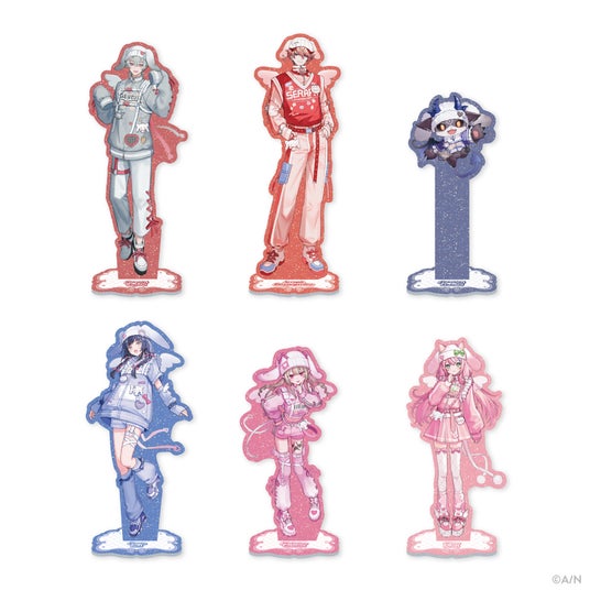 ラメアクリルスタンド、ランダムチェキ風カード、クリアステッカーセット、アクリルキーホルダー、ネームバッジ