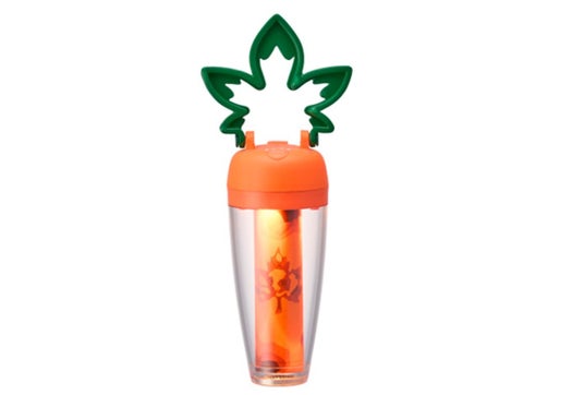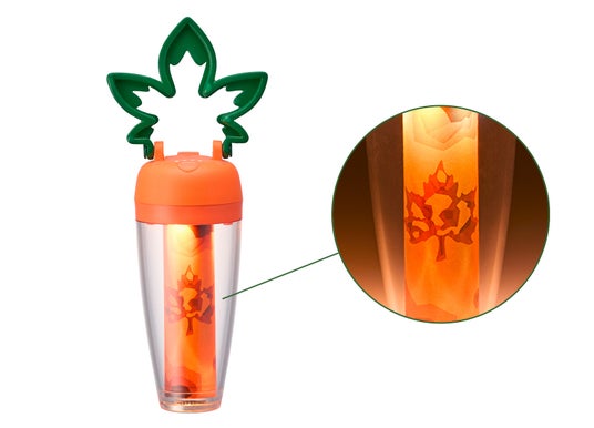 ロゴスのメイプルリーフロゴをにんじんの葉に見立てており、中身のメイプルリーフは「虫食い」バージョンのオリジナルデザイン。暖色のオレンジ光が点灯すると、より「にんじん」らしい見た目に光り、明るく楽しい雰囲気を演出し、インテリアにも最適。