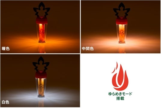点灯モードは4つ搭載し、スイッチを押すと「にんじん」らしくオレンジ色に光る暖色、中間色、白色、ゆらめきの4つのモードで点灯。「ゆらめきモード」は炎のゆらめきをイメージし、落ち着いた雰囲気を演出。ボタンを長押しすると明るさを無段階に調節できる。
