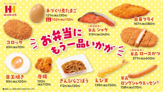 ほっかほっか亭のおかず ほっかほっか亭には、多くのおかずのトッピングメニューがあります。あと一品、何かを足したいときにぴったりです。例えば、セット価格でトッピング可能な「手づくり煮たまご:110円(税込)」や、ホクホクと甘い食感が大人気な「コロッケ:70円(税込)」などがおすすめです。是非、その日の気分に合わせて、ご希望のおかずトッピングをお選びください。 今後もほっかほっか亭では、お店で手づくり、つくりたてのおいしさを皆さまにお届けし、お客さまに楽しんでいただけるさまざまな企画を実施してまいります。 ※西日本店舗での仕様と価格になっています。一部、エリアによってメニューや金額が異なります。