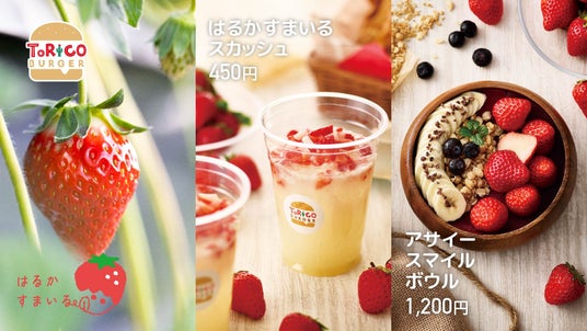 近鉄百貨店が大阪府河南町で育てたいちごの品種「はるかすまいる」は、ほどよい酸味と濃厚な甘さが特長の紅ほっぺです。「はるかすまいるスカッシュ」は、トリコバーガーでも人気のクラフトレモネードにフレッシュなきざみいちごをたっぷりトッピングしています。素材本来のいちごの甘みを活かすように、オリジナルレモネードシロップとソーダを合わせました。