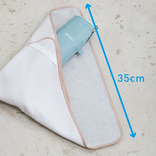 タオルの表裏が自然にくっつく特殊な生地を採用。ボタンやファスナーを使わずに、簡単に包んで留めることができます。吸水性もよく、バッグを濡らさず快適で、もちろん普通のタオルとして手を拭くこともできます。また、柔らかいグレーの面はマイクロファイバー素材なのでPCやタブレットなどを綺麗に拭くことも可能です。