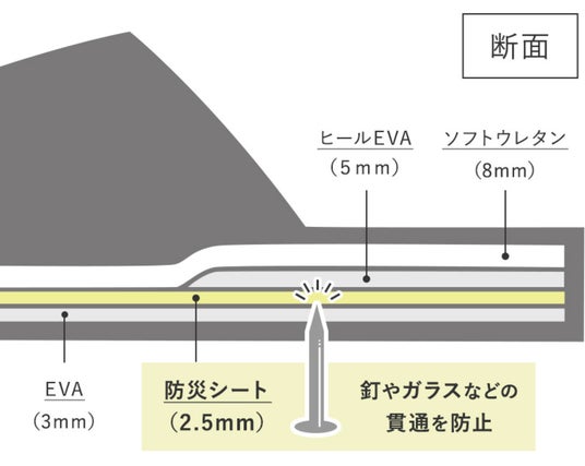 床に散らばったガラスの破片や、釘などを踏んでしまっても貫通を防げるよう、“踏み抜き防止シート”を使用しています。