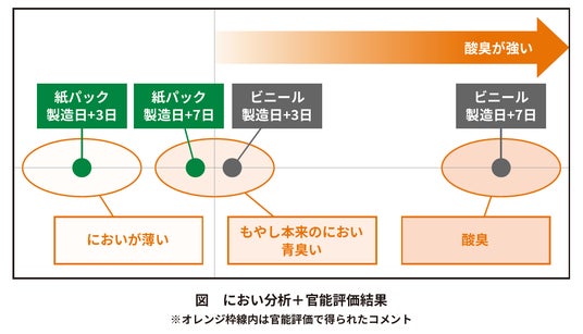 もやしの呼吸に合わせた特別な紙製包材「イキイキ包材」を使用することで、商品の鮮度を保ち、もやし特有のにおいの発生を抑制します。特殊包材で品質が保たれることで、長期間にわたって新鮮な状態を維持することができます。