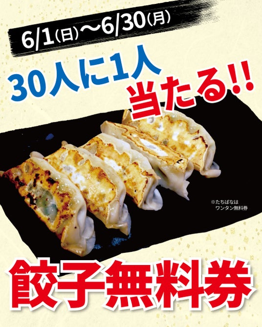 【6/1~6/30】30人に1人当たる!餃子無料券