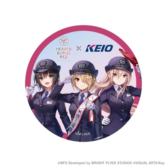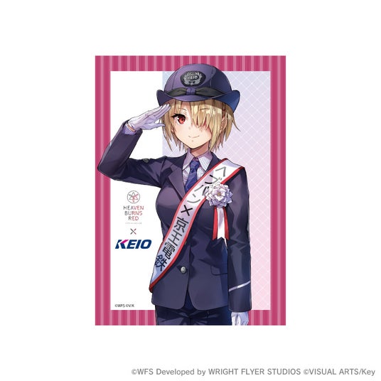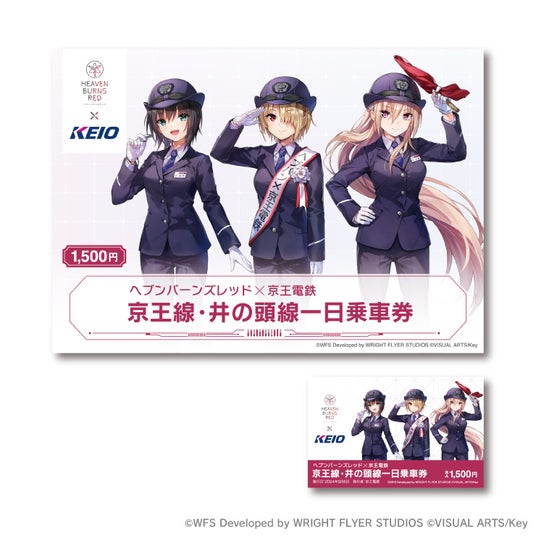 1)実施内容:京王電鉄の駅係員・乗務員の制服を着用したコラボ等身イラスト、コラボミニキャライラスト等をデザインしたオリジナルグッズ、「ヘブンバーンズレッド × 京王電鉄 京王線・井の頭線 一日乗車券」を販売いたします。
