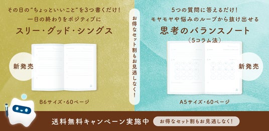 株式会社Awarefy(本社:東京都新宿区、代表取締役 CEO 小川 晋一郎、以下「アウェアファイ」)は、2025年2月14日、運営するAIメンタルパートナーアプリ「アウェアファイ」内で提供する公式オンラインストア「ファイさんのいる雑貨店」において、新商品を発売したことをお知らせいたします。新商品は、アプリでも人気の機能である心理学のフレームワーク「5コラム法」と「スリー・グッド・シングス」を手書きで実践できるオリジナルノート2点です。