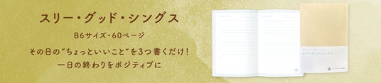 アウェアファイのアプリで一番人気※1の「スリー・グッド・シングス」を手書きで実践できる専用ノートです。まいにちの”ちょっといいこと”を気軽に書き留めて、幸福感を高められます。眠る前に取り組む方が多いこそ、「スマホから離れて紙に書きたい」という声も多く、この度の発売に至りました。