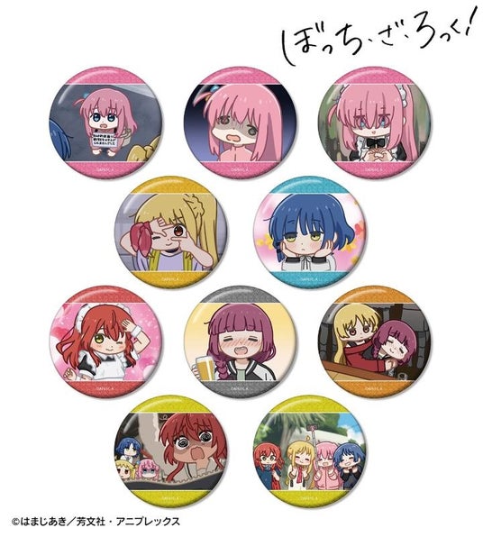 後藤ひとり、伊地知虹夏、山田リョウ、喜多郁代、伊地知星歌、廣井きくりの印象的なシーンのゆるコマイラストをグリッター加工を施した缶バッジに仕上げました。