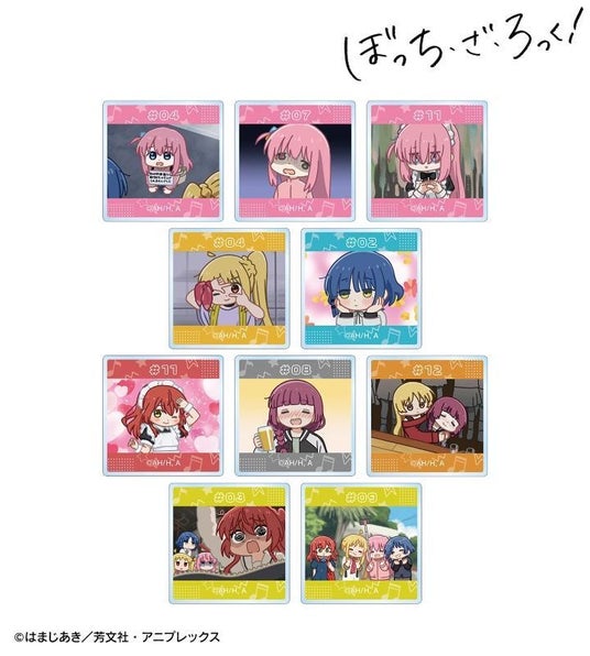 後藤ひとり、伊地知虹夏、山田リョウ、喜多郁代、伊地知星歌、廣井きくりの印象的なシーンのゆるコマイラストをアクリルタイルに仕上げました。
