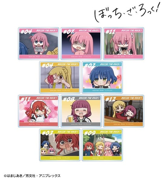 後藤ひとり、伊地知虹夏、山田リョウ、喜多郁代、伊地知星歌、廣井きくりの印象的なシーンのゆるコマイラストをアクリルカードに仕上げました。