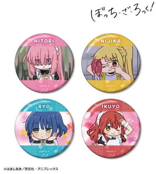 後藤ひとり、伊地知虹夏、山田リョウ、喜多郁代の印象的なシーンのゆるコマイラストを缶バッジに仕上げました。