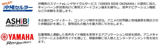 株式会社あしびかんぱにー(代表取締役社長:片桐 芳彦)は、沖縄セルラー電話株式会社(代表取締役社長:宮倉 康彰 以下、沖縄セルラー)、ヤマハ発動機株式会社(本社:静岡県磐田市)と連携し、沖縄発のeレンタサイクルサービス「GREEN RIDE OKINAWA」と、TVアニメ『沖縄で好きになった子が方言すぎてツラすぎる』(以下、「沖ツラ」)とのコラボキャンペーン『「沖ツラGO!」で聴く旅!沖ツラサイクリング』を実施します。 本キャンペーンでは、電動アシスト自転車「GREEN RIDE」で、アニメの舞台となったうるま市の聖地巡礼を楽しめる、コラボ企画を展開します。さらに今回は、位置情報と連動した音声ガイド機能を導入。アニメに登場するキャラクターたちが、声優による録り下ろし音声でスポットごとに案内してくれる、ファン必聴の“聴く旅”コンテンツです。 本サービスは、GREEN RIDE公式サイトよりアプリをダウンロードの上、対象のスポットでレンタサイクルをご利用いただくことで体験可能です。 ■キャンペーン概要 ‣企 画 名:沖ツラ×GREEN RIDE OKINAWA 聖地巡礼キャンペーン ‣期  間:2025年7月20日(日) ~ 9月30日(火) ‣利用時間:10:00~19:00(最終受付17:30) ‣利用場所:東海岸BBQ TERUMA(沖縄県うるま市与那城照間1860-1) ‣利用料金:2,000円/1時間(専用スマホレンタル込み) ■実施内容 ‣声優ナビ付き音声ガイド ファンの没入感を高める新体験コンテンツ!位置情報と連動し、具志川ビーチや公民館、バス停などの聖地に近づくと、アニメキャラクターの声で案内が流れる音声ガイドを提供します。 ‣聖地巡礼マップの配布 ロケ地を紹介するマップをレンタルスポットで配布します。 ‣特別デザインのeバイクレンタル 「沖ツラ」仕様のeバイクを期間限定で提供します。 ‣参加者にオリジナルノベルティをプレゼント(数量限定) キャンペーン参加者には限定グッズやノベルティを数量限定でプレゼントします。 ■各社の協力内容について 本キャンペーンは、各社の強みを活かした連携体制により実現しています。 ■参考情報 ・「GREEN RIDE OKINAWA」 沖縄セルラーと株式会社Jテックが連携し、運営する観光向けスマートeレンタサイクルサービスです。沖縄県・うるま市の工場で生産した電動アシスト付き自転車を、観光施設などに設置されたポートから専用アプリで簡単にレンタルすることが可能です。高強度アルミ材や粉体塗装など高品質な部品を採用し、環境と安全に配慮した沖縄工場製造のモビリティを使用しています。移動の利便性と快適性を両立し、利用者の声を反映した持続可能な観光体験を提供します。 ・「沖縄で好きになった子が方言すぎてツラすぎる」 「沖ツラ」は、沖縄県うるま市を舞台に、沖縄へ転校してきた中村照秋(てーるー)と、同じクラスの喜屋武飛夏(ひーなー)、比嘉夏菜(かーなー)が織りなす、沖縄の日常やあるあるを描いた異文化恋愛群像劇です。 アニメでは、うるま市の観光名所やビーチ、沖縄の街並みが忠実かつ丁寧に描かれており、キャラクターたちが実際にうるま市にある施設を利用するシーンも盛り込まれています。 公式 HP https://okitsura.com/ 公式 X @okitsura(ハッシュタグ #沖ツラ ) (C)空えぐみ・新潮社/「沖ツラ」製作委員会 ■株式会社あしびかんぱにーについて あしびかんぱにーは沖縄生まれの、総合エンターテインメント創造企業です。 沖縄に息づく「あしび(=遊び)」の心を 社名に掲げ、沖縄から世界へ発信します。