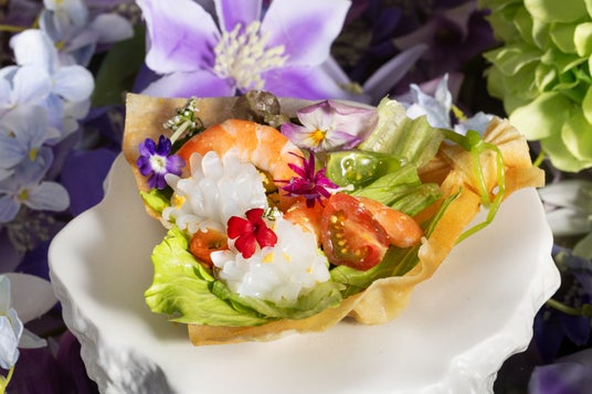 前菜には、湯引きした鱧(ハモ)に柚子を振り香りづけをした後に梅肉醤油をかけた「鱧の湯引き」と、牛ほほ肉をトマトと醤油で和風シチュー風味に煮込んだ後パイで包み揚げた「牛ほほ肉のパイ包み揚げ」の2種をご用意致しました。「ブーケ海鮮サラダ」は、蛇腹折りした春巻きを素揚げにし、その上にレタス、烏賊(イカ)、海老、3色トマトを配し、ともづな特製の人参ドレッシングをかけました。サラダ全体をブーケに見立てた華やかな一品です。料理長が可愛らしさにこだわった寿司は、トロ、鯛、サーモンを福岡県産の米で握ったおにぎり型のシャリに乗せた「おにぎり寿司」3貫と、細かく刻んだ生姜と昆布を甘辛く煮た中具をシャリで包みいなりを被せた「おにぎり寿司 いなり」、「おにぎり寿司 いなり」と同じシャリを錦糸卵で巾着状に包み、仕上げにイクラを添えた「茶巾寿司」が可愛らしく並びます。その他にも鯛の天ぷらにチリソースをかけレタスと卵焼きとともに巻き、とびっこをあしらった「鯛のチリソースロール巻き」と「カクテル寿司」をご用意致します。