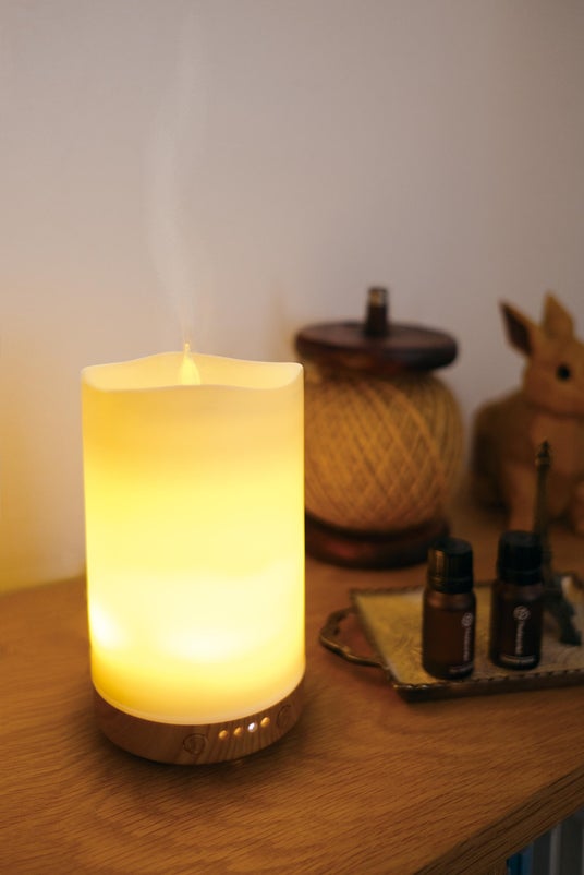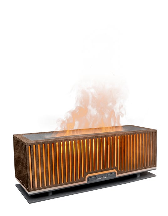 蒸気がまるで暖炉の炎のように揺らいで見える加湿器。ライトはオレンジとブルーの2色に点灯。
