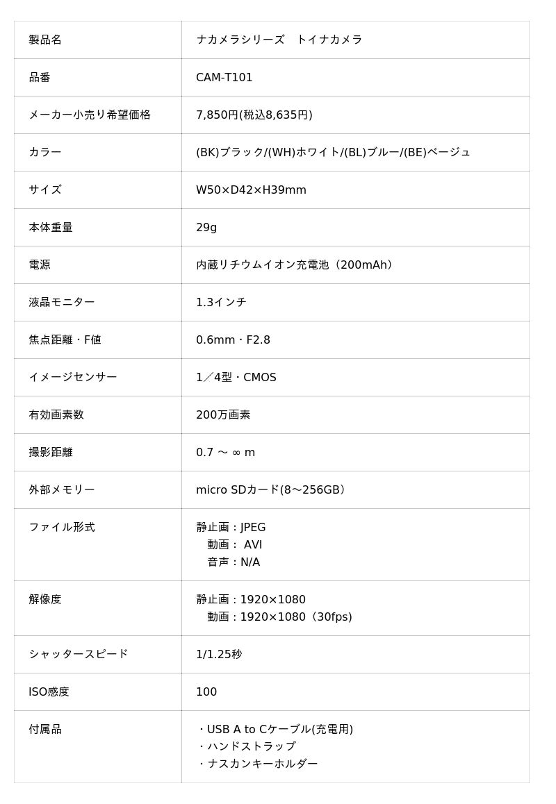 トイナカメラよりさらに小さい、わずか9.5gの小さなミニトイカメラ。撮影には別売りのmicro SDカードを使用します。キーホルダーかと思うほどの小ささですが、撮影できるとわかれば、周りから注目されるかもしれません。