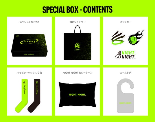 ”GRAVITY”のテーマをモチーフにしたデザインやカリーの代名詞でもある”NIGHT NIGHT”ポーズにちなんだおやすみグッズが入ったスペシャルボックス。