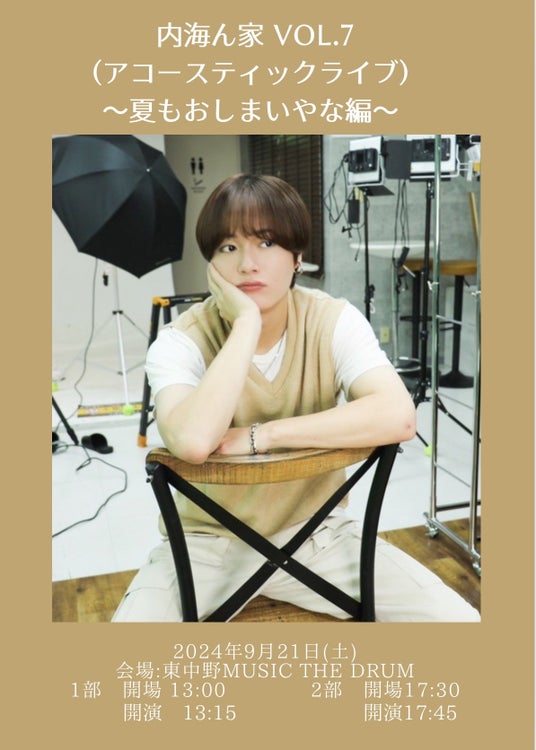 作詞作曲、振り付けを始めセルフプロデュースソロダンスボーカルとして活動中の内海大輔が、2024年9月21日(土)に「内海ん家 Vol.7 (アコースティックライブ ) ~夏もおしまいやな編~」を開催するにあたり、現在一般先着チケットを販売中。1部、2部ともに売切間近となっているので、チェックはお早めに。