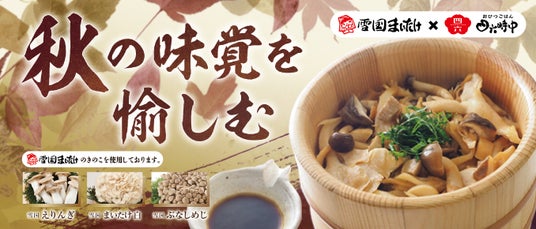 全国のイオンなどのショッピングセンターでレストラン『四六時中』を展開する株式会社イオンイーハート(所在地:千葉県千葉市、代表取締役社長:奥野善徳、以下当社)は、株式会社雪国まいたけ様(所在地:新潟県南魚沼市)と連携し、全国の『おひつごはん四六時中』にて9月18日(水)より秋季限定でコラボメニューを販売します。