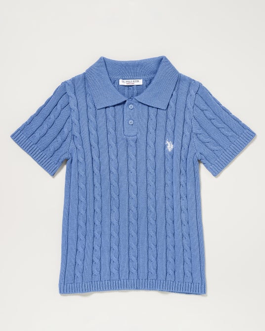 名称 :ケーブル編みニットポロシャツ ダブルホースマン刺繍