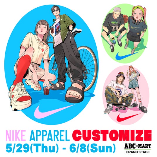 株式会社エービーシー・マート(本社:東京都港区、代表取締役社長:野口実)は、NIKEの夏の新作アパレルの発売を記念した「NIKE SUMMER COLLECTION」キャンペーンを5月22日(木)より全国のABC-MART及び公式オンラインストアにて開始します。今回のキャンペーンでは、新作アパレルのビジュアルの公開や、5月29日(木)からはビジュアルを基にイラストレーターのNAKAKI PANTZ(ナカキパンツ)氏が描き下ろしたオリジナルステッカーのノベルティキャンペーンを実施。さらに、ABC-MART GRAND STAGE銀座店、ルクア イーレ店ではNIKEのアパレルをオリジナル圧着シートでカスタマイズできるポップアップイベントを5月29日(木)より開催します。