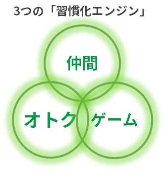 昨今、歩くモチベーションとしてゲーム要素やオトクなポイント要素が搭載された様々なウォーキングアプリが登場しています。aruku&においても、ウォーキングを習慣化するエンジンとして、(1)楽しいゲーム要素、(2)プレゼントが当たるなどのオトク要素に加え、(3)チームや同僚など仲間で楽しむ要素を提供していますが、それぞれに接触しているユーザーは、接触していないユーザーに比べ継続率が高くなるということがわかりました(※利用開始6か月後の継続率:ゲーム要素1.8倍、オトク要素1.4倍、仲間要素2.0倍)。