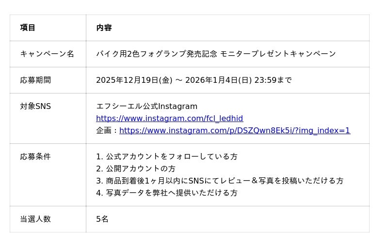 車・バイク用カスタムパーツ専門店エフシーエル(fcl.)を展開する株式会社WiNEEDS HOLDINGS(所在地:広島市南区、代表取締役社長:尾田 雅史)は、2025年12月23日(火)より、夜間や悪天候時のライダーの視界をサポートする新製品「バイク用 2色切り替え×調光式フォグランプ」の発売を記念し、公式Instagramにて無料モニターキャンペーンを開始します。