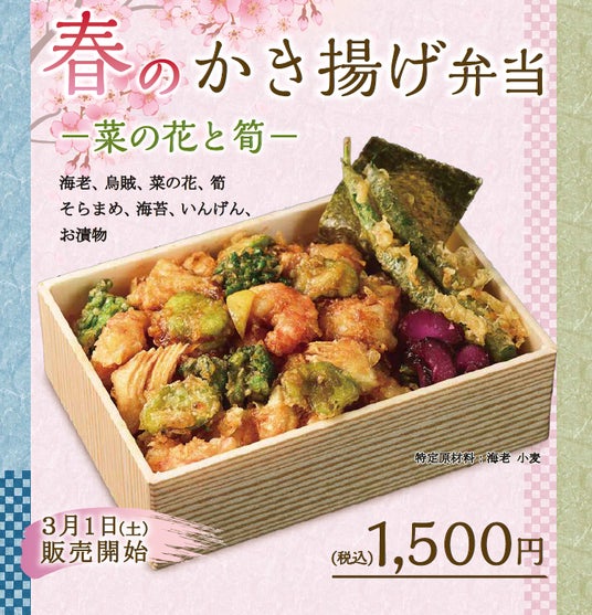 春のかき揚げ弁当~菜の花と筍~定番の海老や烏賊に旬の菜の花、筍、そらまめ等、春を感じる食材を使用し、相性の良い「秘伝の丼たれ」を絡めてお召しいただきます。ご自宅でのご飯やご移動、行楽のお供に是非お買い求めください。 発売日:2025年3月1日(土)