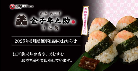 人気飲食店、つけ麺「つじ田」や、「中華そば専門 田中そば店」などをグループで運営する、オイシーズ株式会社(所在地:東京都 千代田区 、代表取締役社長:工藤 智)傘下の株式会社 and RICEが運営するテイクアウト業態の「日本橋 天丼 天むす 金子半之助」は、2025年3月度の期間限定店舗として、今回初出店となるシャポー小岩(東京都江戸川区)、を含む東京、神奈川、千葉、埼玉の計11箇所の百貨店や駅ビル等、各施設の催事場や特設会場へ出店いたします。また、常設店舗では「季節限定新商品」を販売しております。