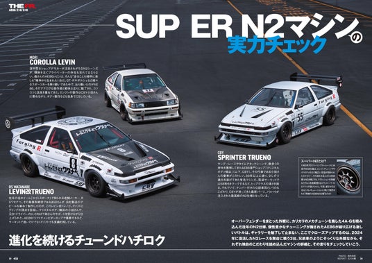 AE86のスーパーチューニングカーで争われる「スーパーN2」に参戦している、RSワタナベのレビン改トレノ、クリスタルボディ横浜のスプリンタートレノ、そしてプライベーター森さんのカローラレビンの3台が、富士スピードウェイに集結。それぞれのスペックを紹介している。