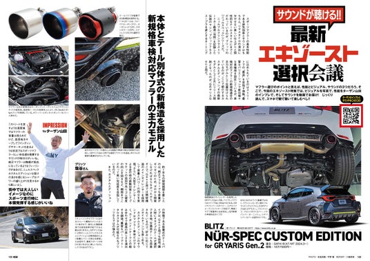 さらに第2特集では、最新マフラー情報を展開。ターザン山田のインプレとともに、マフラーの音が動画で楽しめるぞ。ブリッツ・GRヤリス、ロッソモデロ・シビックタイプR、フジツボ・ハチロク&GR86というラインアップだ。