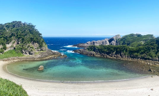伊豆大島 野田浜 ・新島 - 美しい海、アート、そして心のリセット 透き通る海と真っ白な砂浜が広がる、まるで海外リゾートのような島。