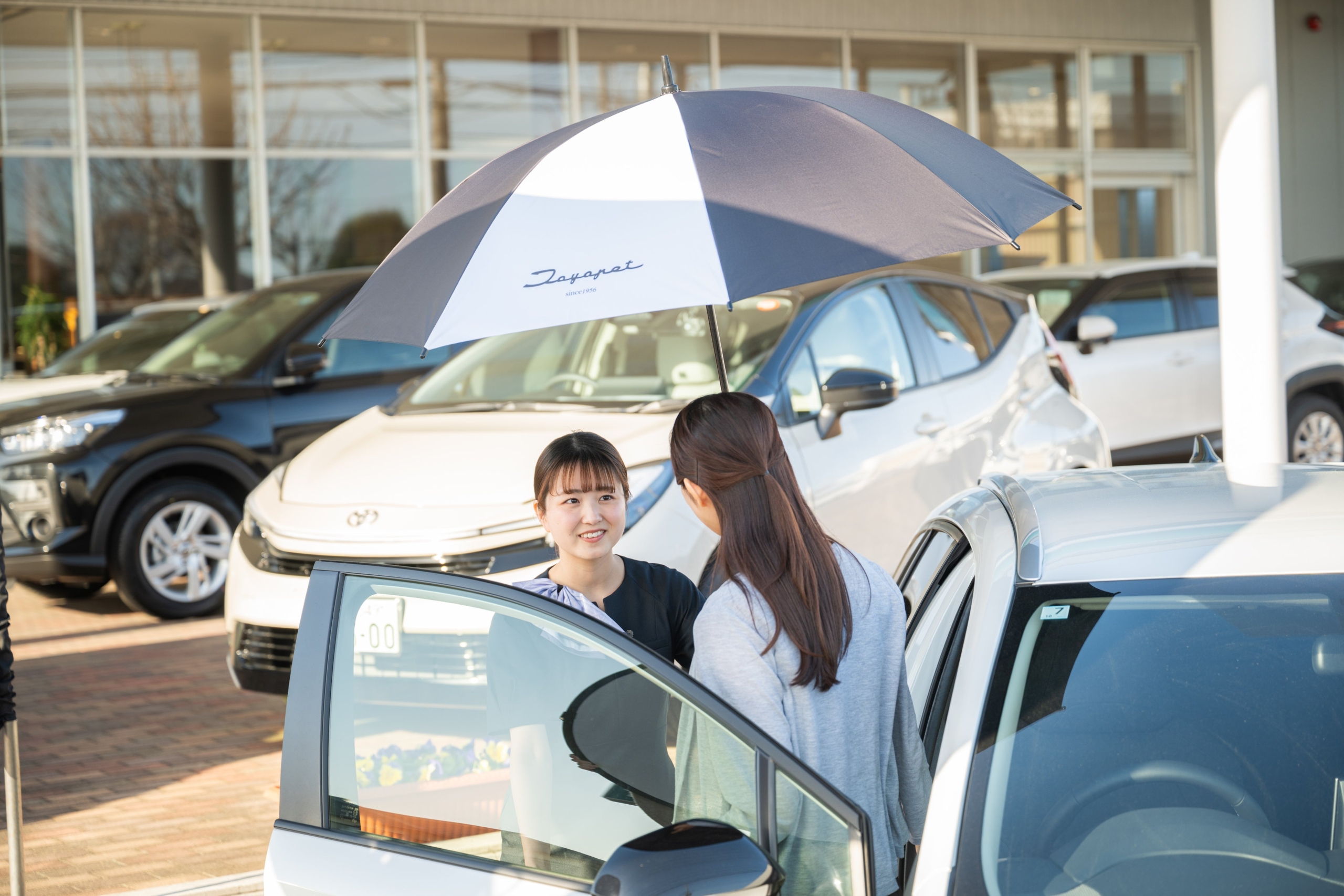 雨の日のご来店時や、屋外でお車をご覧いただく際、お客様に触れる「傘」もまた重要なおもてなしの一部であると考え、このたびのデザイン・機能刷新に至りました。