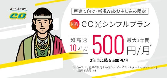 また、本プランをより気軽にご体験いただくため、eo公式アプリ「eoアプリ」からキャンペーン登録いただくことで「eo光シンプルプラン 10ギガコース」の月額基本料金が最大1年間500円になる「eoアプリ登録者限定!eo光シンプルプランスタートキャンペーン」および標準工事費が実質無料になる「eo暮らしスタート割(eo光シンプルプラン標準工事費割引)」も実施いたします。