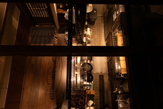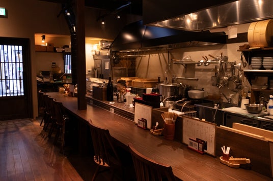 古き良き京町屋の風情を活かした店内は、目の前で調理を楽しめるライブ感あふれるカウンター席と、開放感のある吹き抜けのテーブル席をご用意しております。