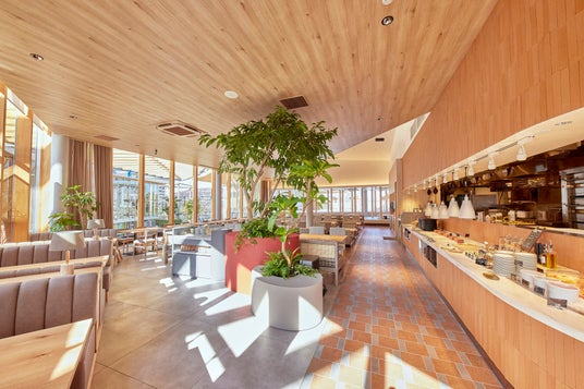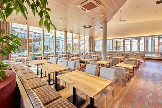 グリーンが溢れ、大きなガラス窓から光が差し込む開放的な店内は、時間を忘れてゆったり寛ぐことができます。店内のテーブルや通路はベビーカーや車椅子が入りやすいよう大きくゆとりが取られ、ご家族全員でご利用しやすいように考えられています。小さなお子様連れが嬉しい掘りごたつの座敷席やソファ席に加え、授乳室もご用意しており、子育て世代に優しい店舗を目指します。