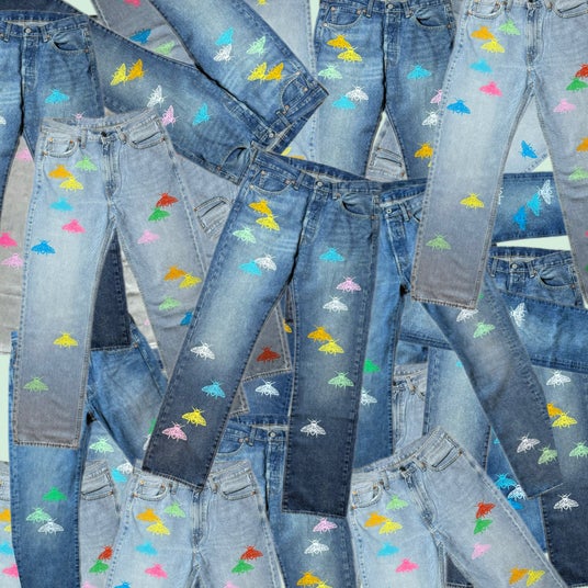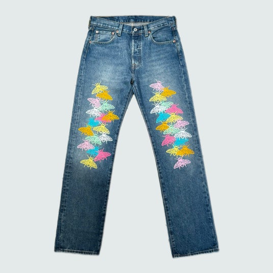 今回発売された「BEE MY DENIM by Levi's 501」は、新品のLevi's デニムをベースに、フェルトのような質感が特徴のフロッキープリントを随所にあしらったカスタムエディション。