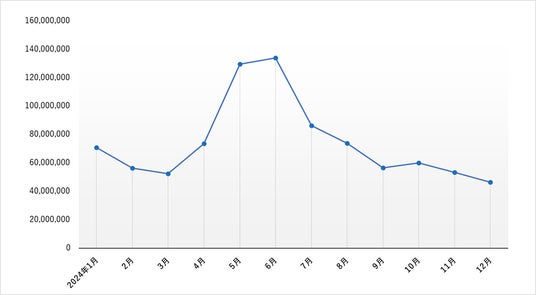 2024年、カスペルスキー製品は、ユーザーがフィッシングサイトへアクセスする試みを8億9,300万回以上ブロックしました。これは、2023年の7億1,000万回から26%増加しています。5月から7月にかけての急増は、例年通り休暇シーズンに関連しており、詐欺師が偽の航空券やホテルの予約、偽のツアーパッケージの予約など、かなりお得と感じるような情報を用いて旅行者を狙う時期でもあります。