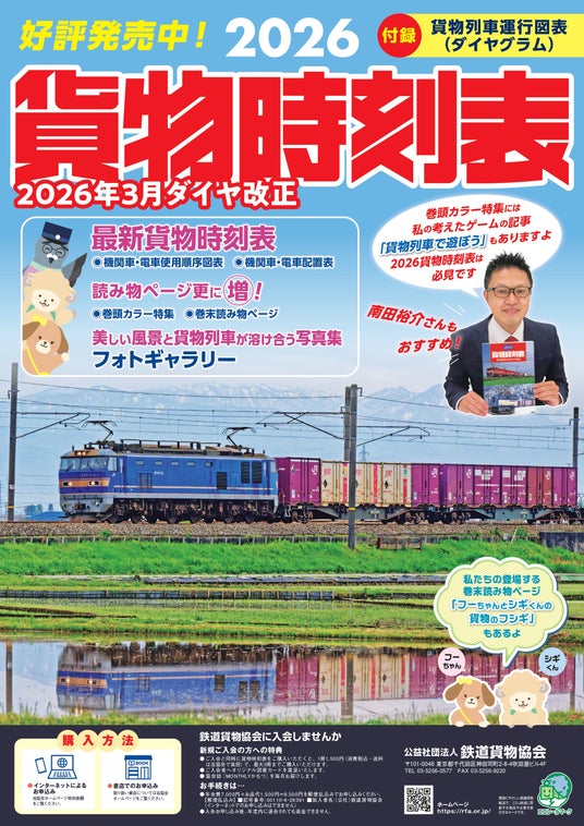 そんな方にピッタリな読み物は、公益社団法人鉄道貨物協会(本部:東京都千代田区)が発行する「2026貨物時刻表」です。「2026貨物時刻表」は全国の最新の貨物列車の時刻表であると同時に、貨物列車の読み物がたくさん詰まっている「貨物列車の総合ガイドブック」なのです。