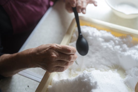 この海水をさらにRO膜でろ過し、濃縮した後、独自技術で釜炊き。にがりや水分を取り除き、塩を結晶化させます。その後、手作業で微細な不純物を取り除き、丁寧に仕上げたものが 「沖縄黒島の塩」 です。