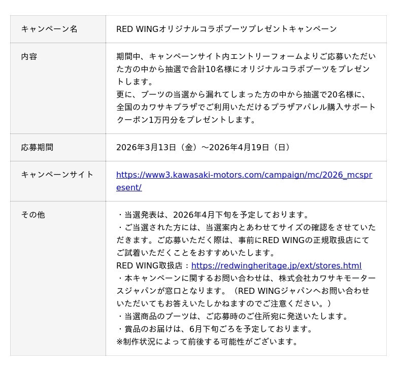 株式会社カワサキモータースジャパン(本社:兵庫県明石市、代表取締役社長:佐伯 健児)では、2026年3月13日(金)より、抽選で10名様にアメリカの老舗ブーツブランド『RED WING』とコラボしたオリジナルデザインのブーツが当たるプレゼントキャンペーンを実施いたします。