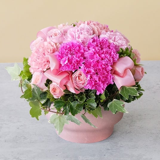 ピンクのバラとカーネーションのコントラストが美しさをさらに際立たせ、同色のリボンが可愛らしさを添えています。